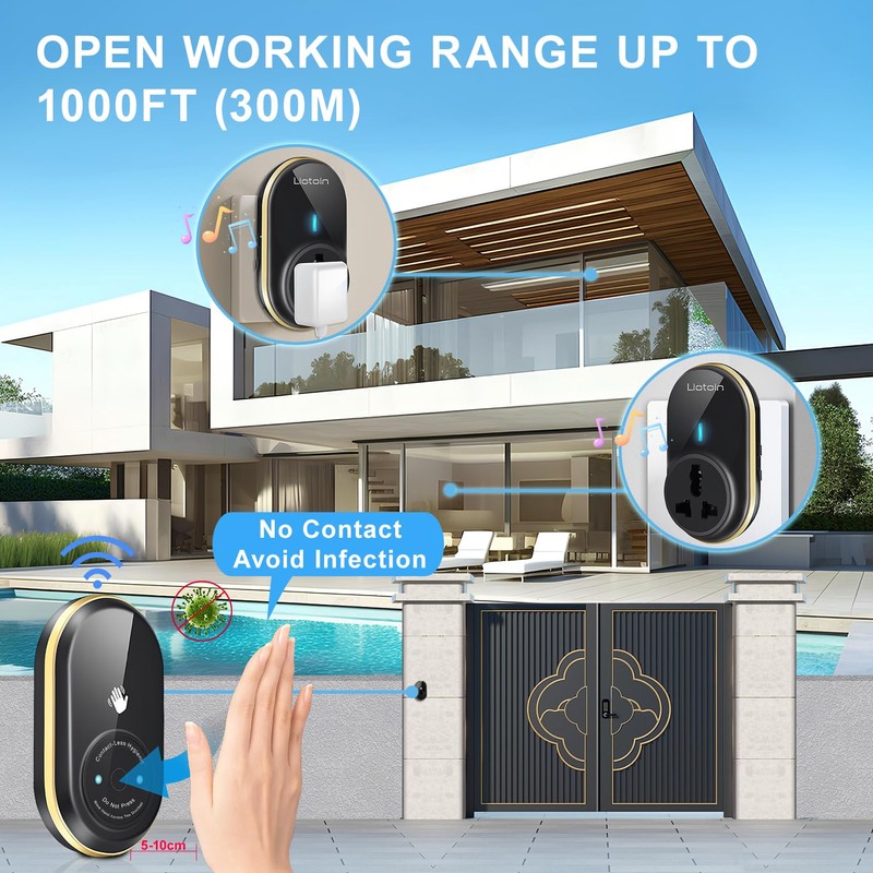 LIOTOIN Wireless Door Bell Waterproof Induction Doorbell, No Contact Required,Doorbell Chime with Extra Socket,Easy to Install,Operating Range of 1000 Feet, Suitable for Home Office Classroom