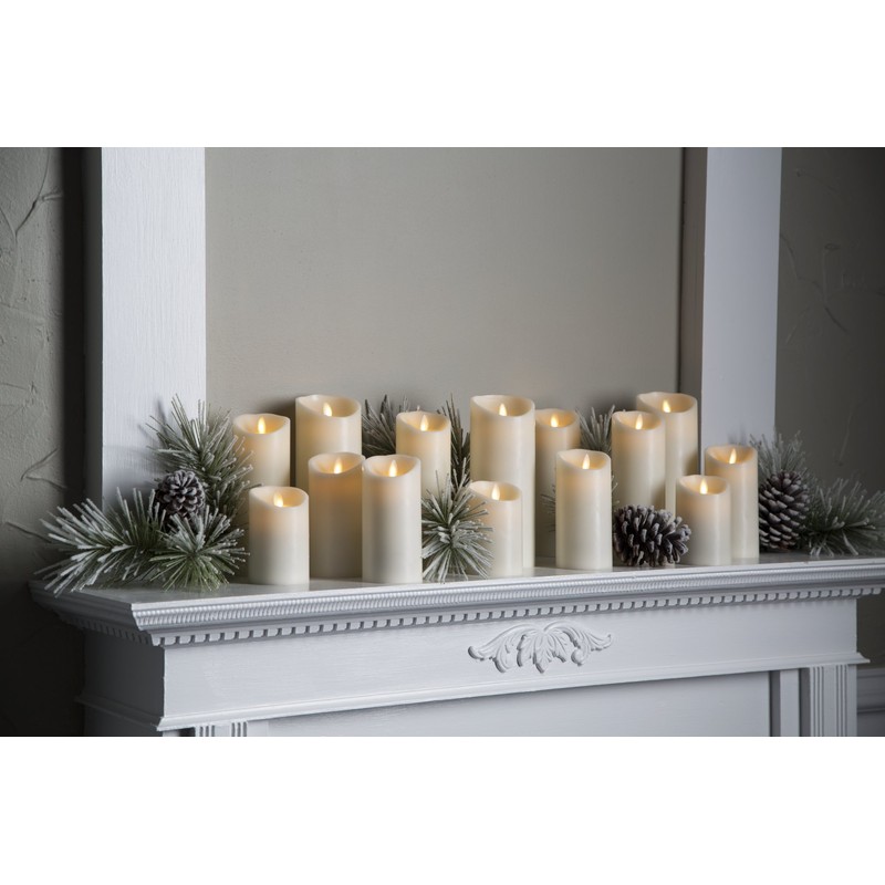 - Liown moving flame, ivory LED flameless pillar candles with timer lights up your space with a flickering, glowing effect. Battery powered using 2 D batteries.