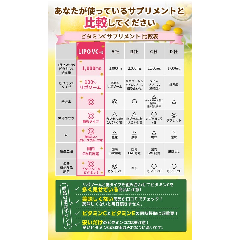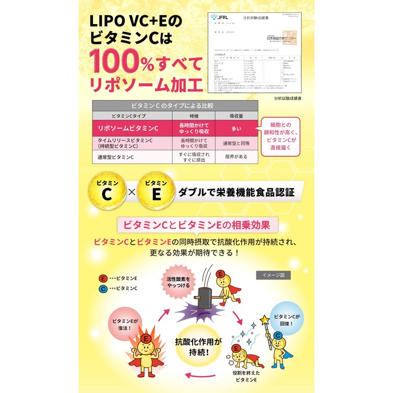 - 【リポソームビタミンC100%】通常のビタミンCやタイムリリースビタミンCを合計して1,000mg/日〜2,000mg/日の商品が多い中、LIPO VC+Eは一袋にぎっしりリポソームビタミン1,950mg(ビタミンC1,000mg含有)