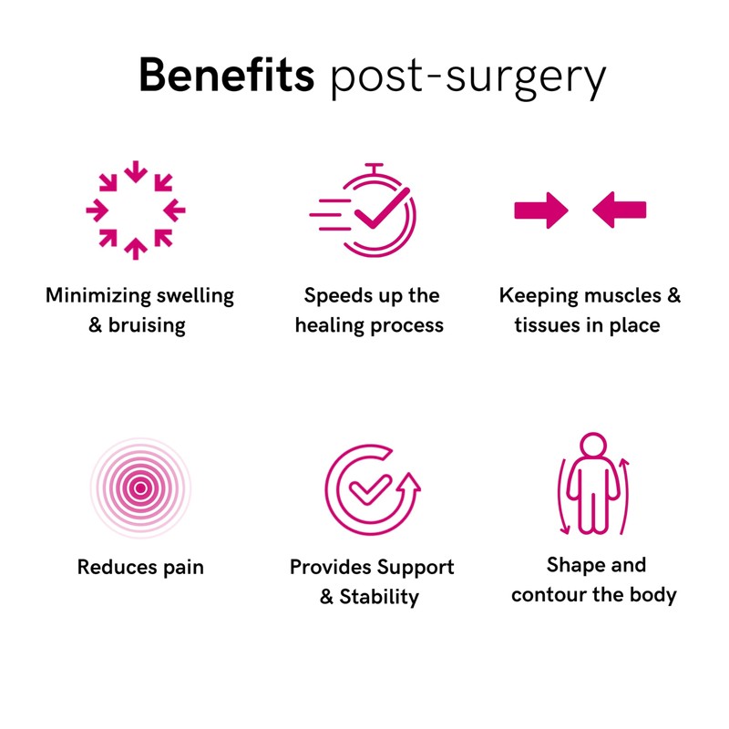 The success of any plastic surgery is reliant upon not only the skill of the surgeon, but also the quality of aftercare; compression therapy forms a large part of this process and is crucial for satisfactory healing. Wearing the correct garment post-operatively is proven to speed up the healing process and minimise swelling and bruising, as well as reducing pain. For this reason, compression garments are an important part of the surgery. Patients wearing compression garments after plastic surgery have been reported to have more satisfactory results.