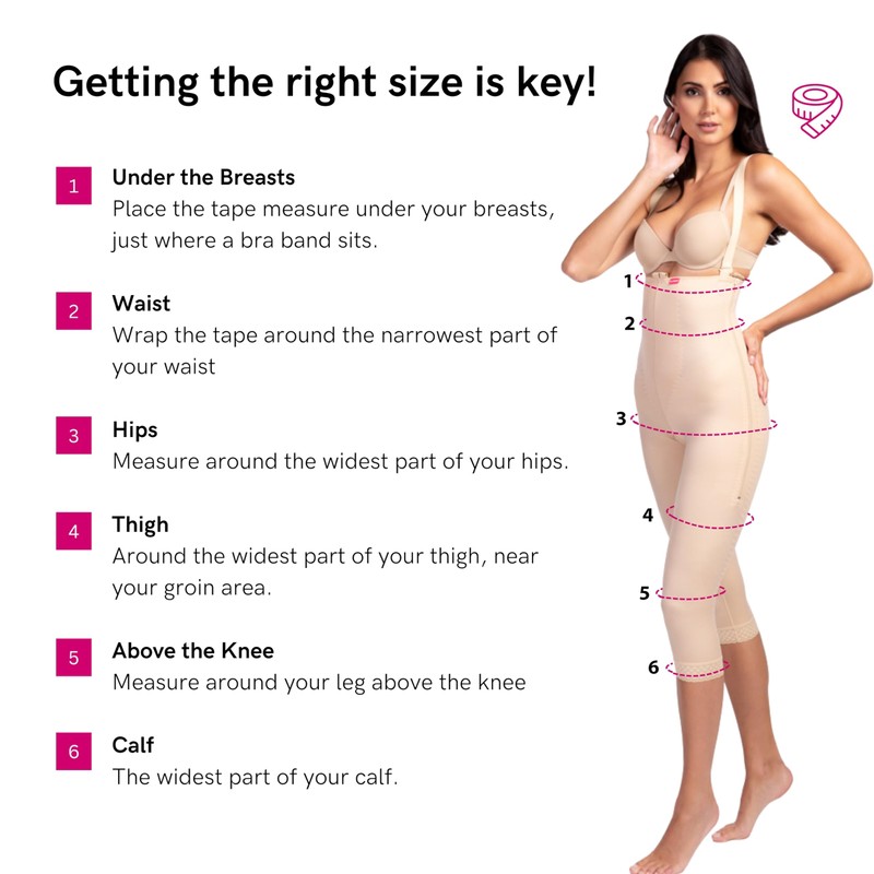 - Perfect Fit. Our sizing differs from regular clothes, so measuring your underbust, waist, hip, thigh, above knee, and calf is key. Follow our infographic for the best fit in your lipo compression garment or compression garment after liposuction.