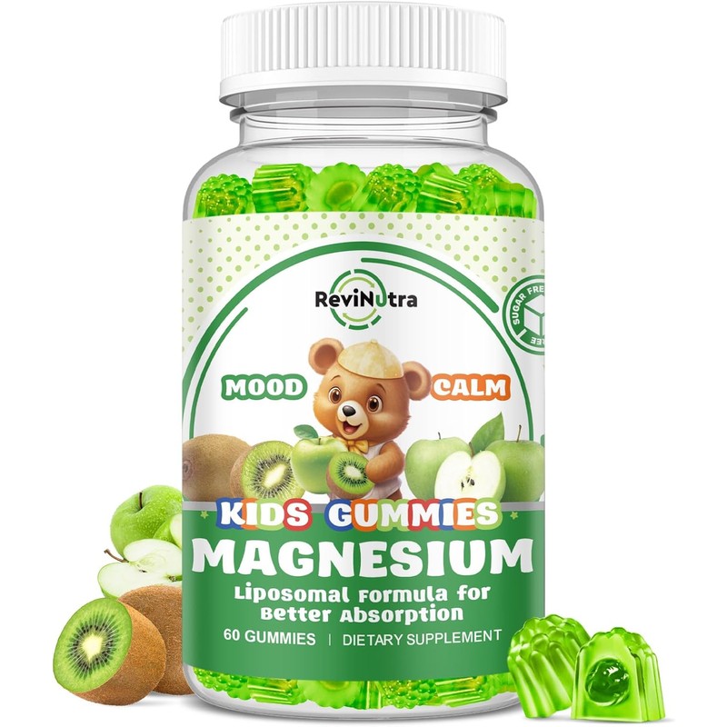 Liposomal Kids Magnesium Gummies – Glycinate with Omega-3, Vitamin B6 & D3 – Calm, Stress Relief, Bone & Mood Support – Green Apple Kiwi Flavor – 60 Count