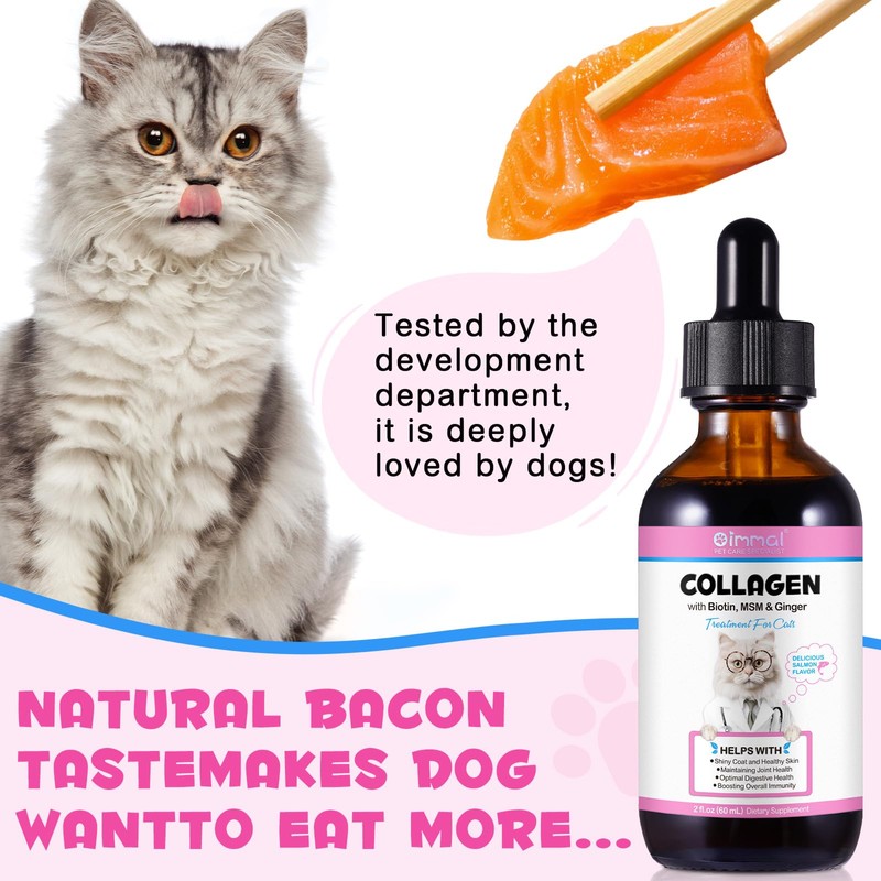 - OIMMAL Liquid Collagen for Cats Boost for Cats with Biotin, MSM & Ginger is a premium, veterinarian-crafted formula designed to elevate your cat’s overall health and vitality.