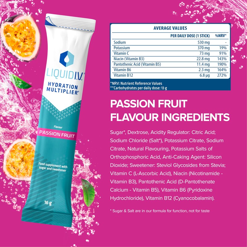 Liquid I.V. Hydration Sachets | Passion Fruit | Electrolyte Powder Mix | 1 Pack (16 Sticks) | 7 Vitamins and Minerals | Vegan