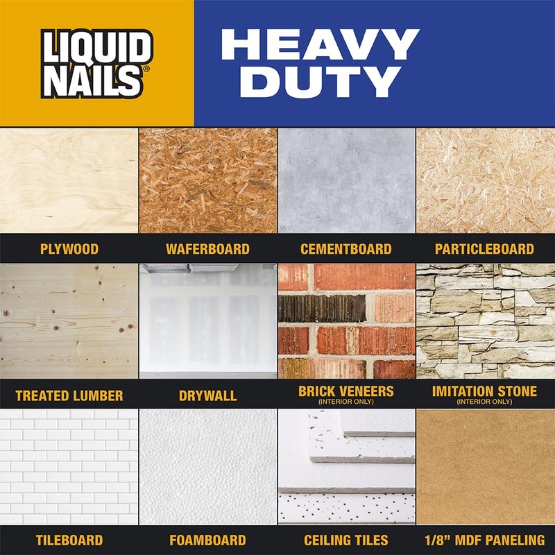 - Bonds a wide range of construction materials including wood, treated wood, plywood, OSB, drywall, tileboard & more