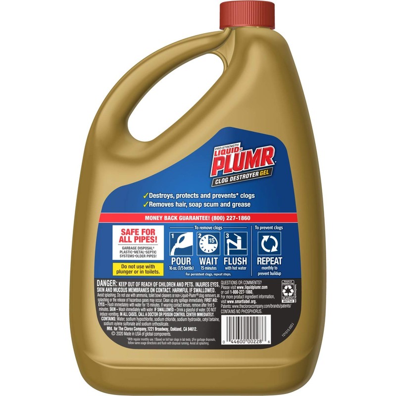 • DRAIN CLOG REMOVER: Liquid-Plumr Clog Destroyer Gel with PipeGuard uses 3-in-1 action to dissolve tough clogs, prevent new ones from forming, and remove unpleasant odors; Package may vary