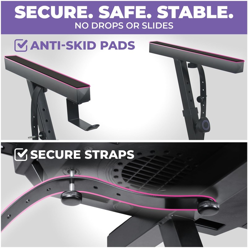 - Includes headphone hook and anchoring straps: Each keyboard stand includes four adjustable feet, anti-skid foam pads, and a headphone hook. Also included are two anchoring straps that attach the keyboard to the stand for extra stability and protection. Great for musicians on the road or kids just learning at home.