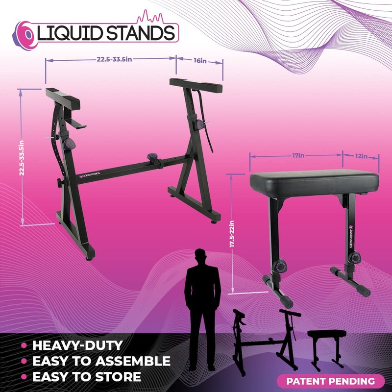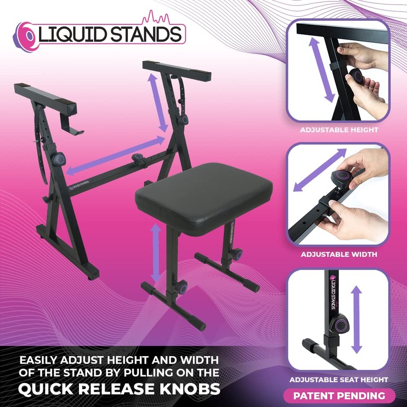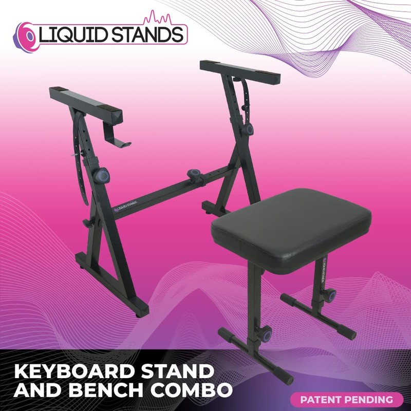 Liquid Stands Piano Keyboard Stand and Bench Set - Portable Heavy Duty Digital Piano Stand for 54-88 Key Electric Pianos & Adjustable Piano Bench, Chair, Stool - Sturdy Keyboard Music Stand and Seat