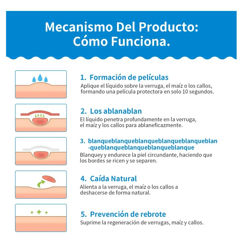 Lave y seque el área afectada antes de usar. El pequeño cepillo incluido se fija a la tapa de la botella, moje el líquido y aplique y cubra toda la verruga 1 o 2 veces al día hasta que se desprenda; Recuerde limpiar el cepillo después de cada uso