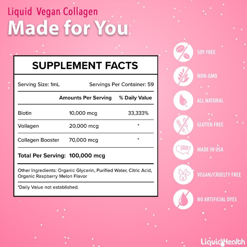 - VEGAN COLLAGEN DROPS FOR HEALTHY HAIR, SKIN, & NAILS: Liquid Health's Vegan Liquid Collagen drops are the first of their kind! Made with 100% plant-based Vegan Collagen AKA "Vollagen" and essential vitamins and minerals to support your body's natural collagen production. Nourish your body from the inside out for lustrous shiny hair, hydrated glowing skin, strong healthy nails, and a boosted metabolism.