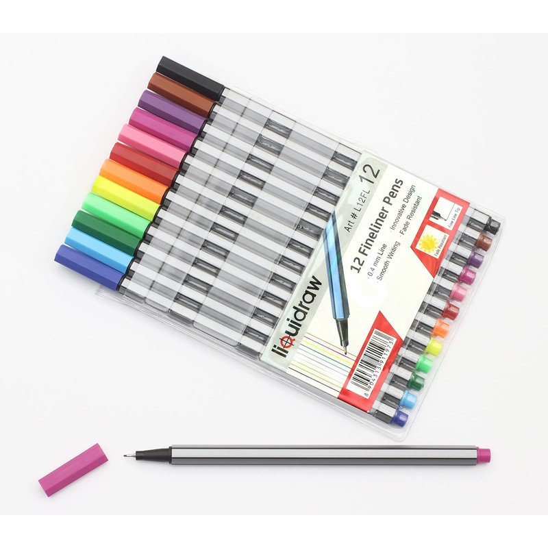 Liquidraw 12 Fineliner Colouring Pens Set Fine Point Pens 0.4mm Assorted Colours, Fineliners Coloured Pens