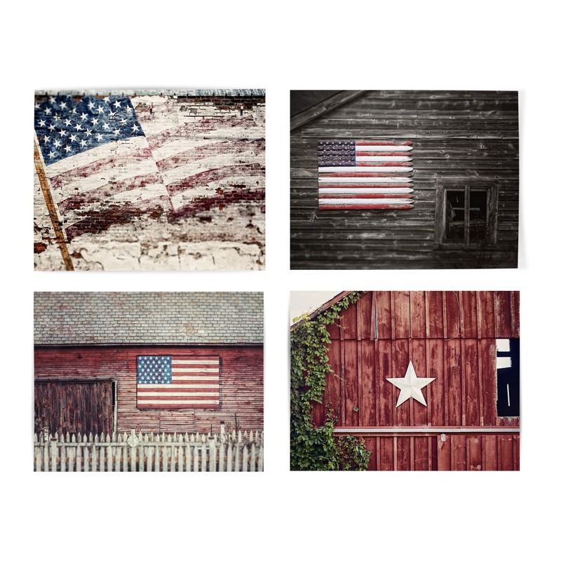 Lisa Russo Fine Art - Patriotic Farmhouse American Flag Barn Landscape Picture Prints - Set of 4 - Not Framed - Red, White, Blue Americana (4 5x7 Prints)