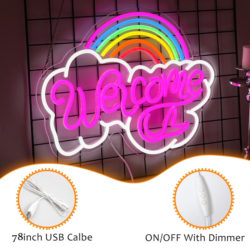 LISIGNVE Rainbow Welcome Neon Sign Cloud Light Up Sign Welcome Led Sign Rainbow Neon Light with USB for Bedroom Wedding Party School Business Wall Decor (16.5”*12.6”)