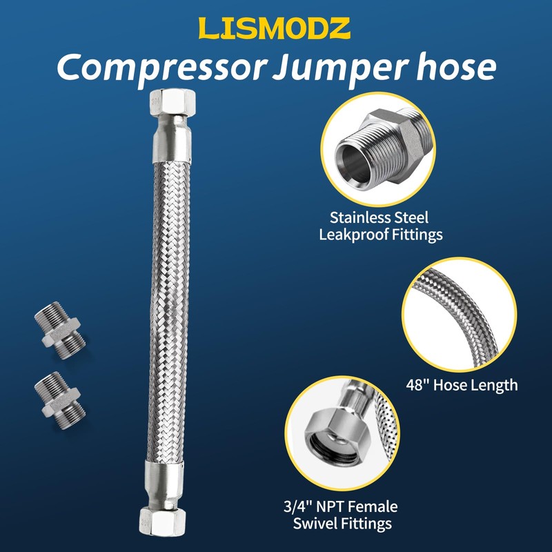 LISMODZ Compressor Jumper Hose, 3/4" NPT Male x 20" Length - Flexible Industrial Grade Stainless Steel Hose with Two 3/4" Adapters, 450 PSI &750°F, Both Sides Fittings Rotate Freely