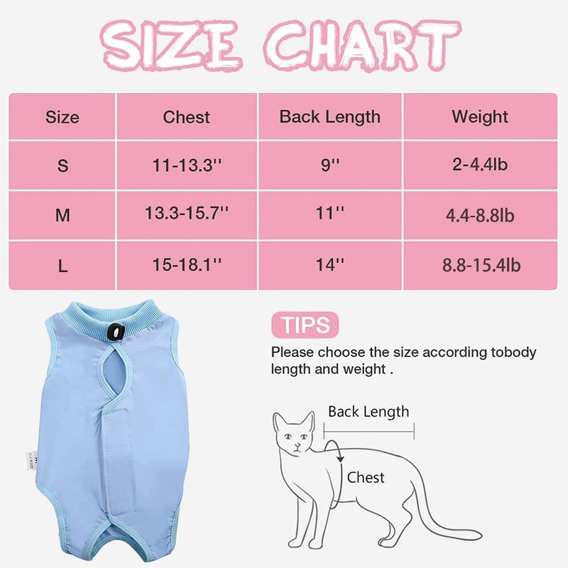 - 【Size Measurement】: There are 3 sizes of recovery suits for cats, which can fit most cats. S:Neck 7-7.8” ,Chest 11-13.3”,Back Length 9”,Fit cat Weight 2-4lb; M:Neck 7.8-10.2”,Chest 13.3-15.7”,Back Length 11”,Fit cat Weight 4-8lb; L:Neck 9-11.8”, Chest 15-18”,Back Length 14”,Fit cat Weight 8-15lb.(Please refer to the size chart on the left and make sure that the size is correct before you choose to buy.)