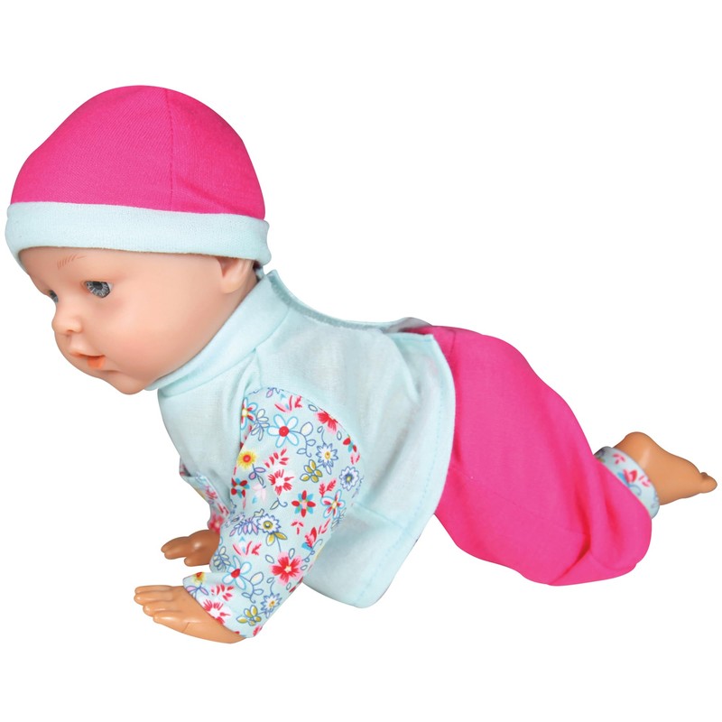 • DRESSED FOR CUTENESS & COMFORT: The Crawling Baby Doll wears a charming blue floral top with matching pink cap and pants, creating a sweet and stylish look that's perfect for cuddles, roleplay, and on-the-go adventures.
