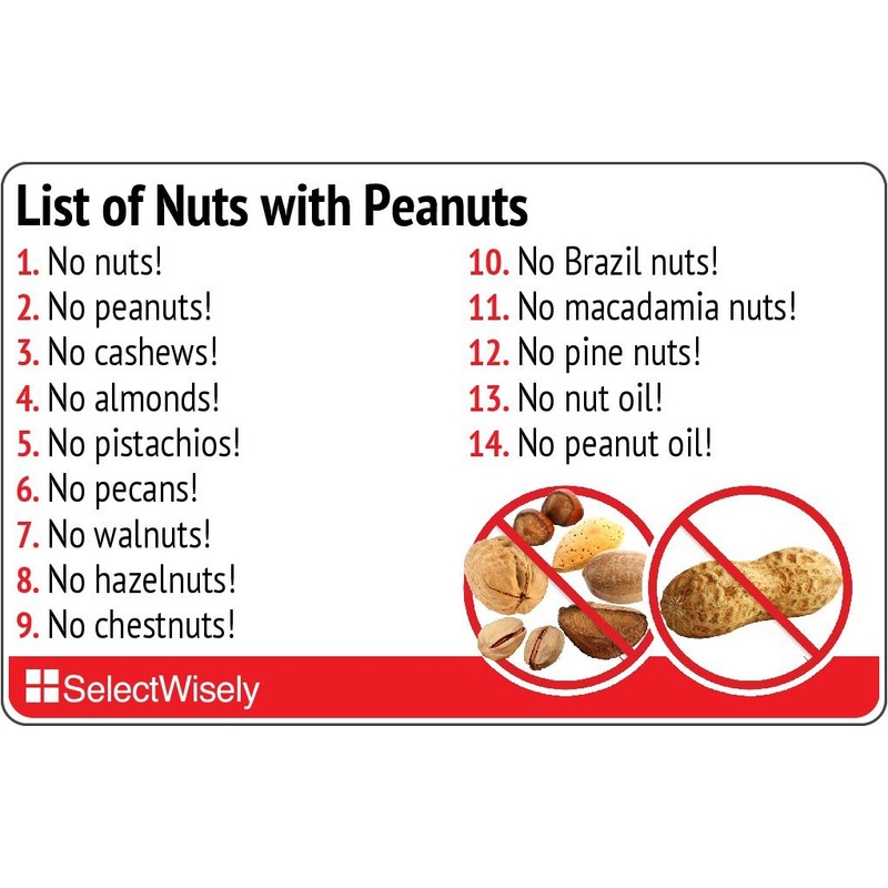 Whether you're traveling to restaurants in foreign language speaking countries or dining locally, you can communicate your nuts and peanuts food allergy needs clearly and effectively by using our carefully translated List of Nuts with Peanuts allergy card. Our List of Nuts and Peanuts cards are available in various languages such as Spanish, Italian, French, Thai, Chinese and more. Translations Included: No nuts! No peanuts! No cashews! No almonds! No pistachios! No pecans! No walnuts! No hazelnuts! No chestnuts! No Brazil nuts! No macadamia nuts! No pine nuts! No nut oil! No peanut oil!