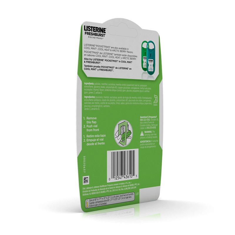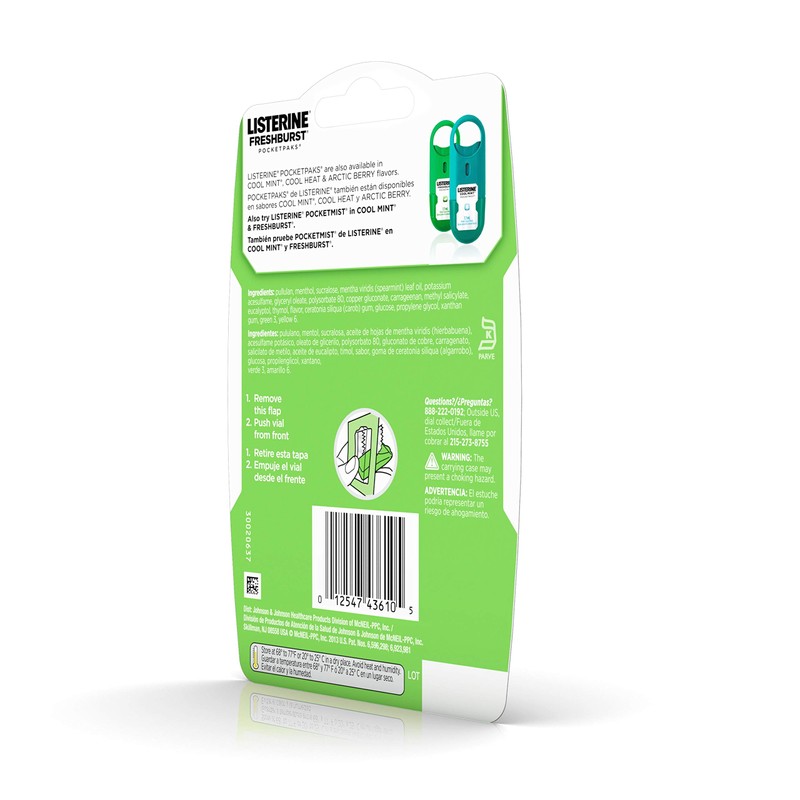Refresh your mouth with Listerine Freshburst Pocketpaks Breath Strips. These breath strips dissolve instantly, killing 99 percent of germs that cause bad breath*. Slip your pack into your purse or pocket, so you can easily get fresh breath and kill bad breath germs after your morning coffee, or before a meeting or date. Each strip has a refreshing Freshburst flavor and kills germs for a clean mouth feeling. *In laboratory tests. Directions: 1. Remove this flap 2. Push vial from front