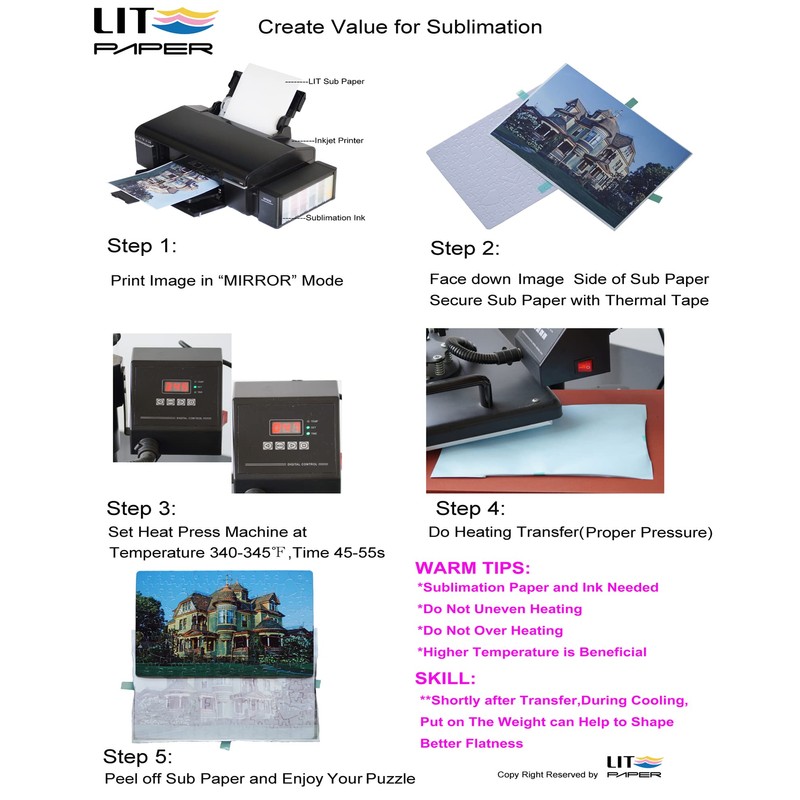 • EASY TO DIY: Firstly print photos/images/designs(with Inkjet printers and sublimation ink only) onto LIT sublimation paper and then heat transfer to the white side of blank puzzles. Transfer suggestion: 340-345℉, 45-55 seconds, proper pressure.LIT sublimation paper has fast transfer feature,saving your time and money,keeping your beautiful moments in a different and funny way.