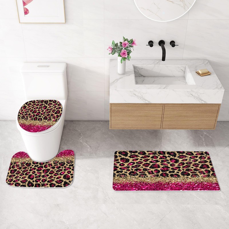Litabel 4 Pcs Hot Pink Leopard Print Shower Curtain Set with Non-Slip Rugs, Toilet Lid Cover and Bath Mat, Wild Animal Skin Bathroom Decor Set with Shower Curtain and Rugs(Hooks Not Included)
