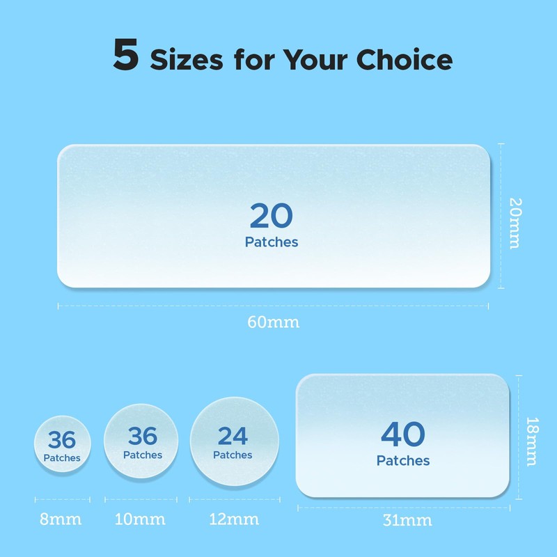 - 5 Sizes 156 Patches: Compared to other brands of pimple patches for face, LitBear offers you the more sizes: 8mm, 10mm, 12mm, 14mm, 26*38mm, 20x60mm & 60x60mm XL pore strips, these combination zit patches will help you with the smallest of blemishes to the biggest of breakouts! Choose the best one for your affected area
