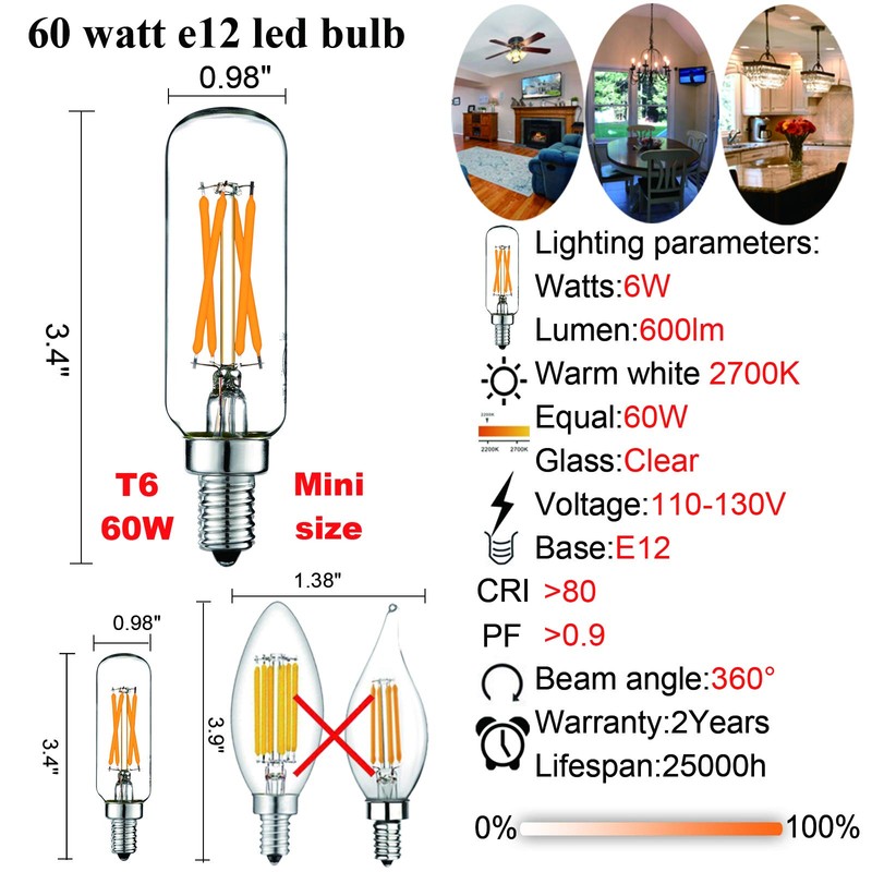 - 【LIFESPAN AND WARRANTY】:E12 led bulb dimmable is up to 25000h life span and two years guarantee,No longer to get your ladder out and chang the burnt-out in darkness frequently;Email us via your order if you face any problem, replacement candelabra base led light bulbs or refund would be applied under warranty