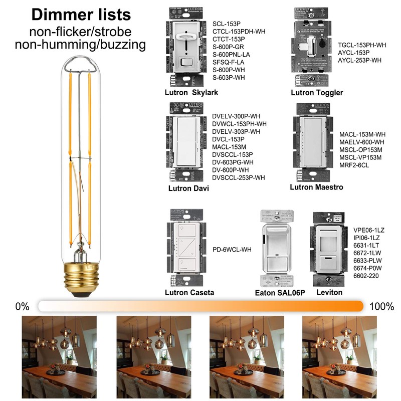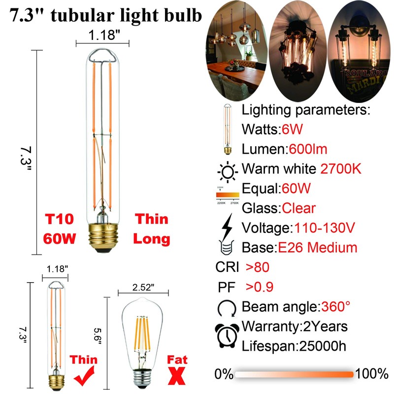 - Smooth Dimmable&Skinny&Long:7.3Inch long E26 light bulb is smooth dimming 0%-100%,tested compatible with 95% dimmers,Such as Skylark,Davi,Toggler,Caseta,Maestro,Rotary Preset Dimmer,SAL06P,etc;Narrow retro e26 edison bulb suitable for most light fixture with medium E26 socket,especially for fixtures with light bulbs in rustic Pendant,Chandeliers,Sputnik,Island,foyer,Wall scones,Vanity,Cabinet,Industrial pipe fixture,piano desk lamp,etc.