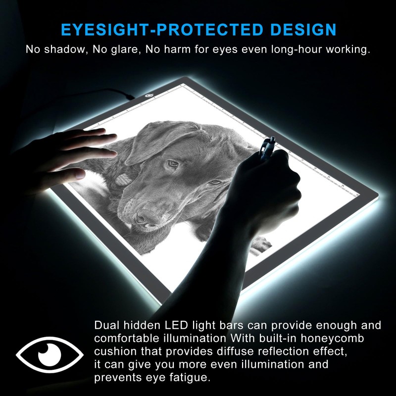 - NO SHADOW, NO GLARE, PROTECT EYES. The light pad provids ideal working lighting environment for penmanship and design. Providing the most comfortable lighting environment for animators, designers, art enthusiasts. children and reader.