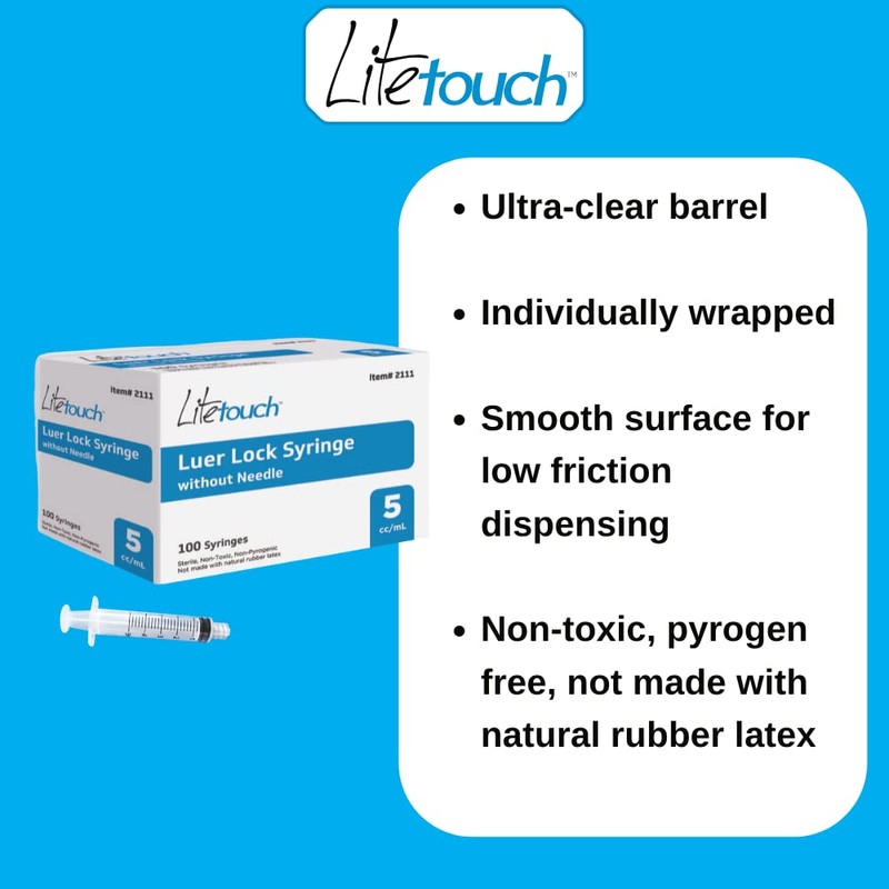 LiteTouch 5mL Luer Lock Syringe, Sterile, Individually Sealed - 100 Syringes per Box (no needle)