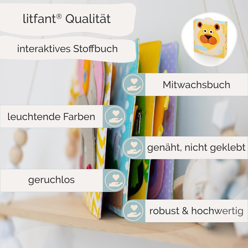 litfant® Original Baby Book - Lion Ben | Crinkle Book | The Interactive Baby Fabric Book for Promoting Motor Skills Learning Ability | Feeling Book Montessori Book for Girls and Boys from 3 Years