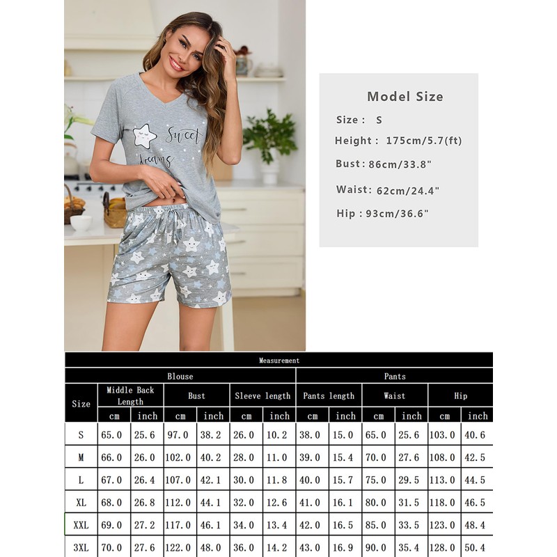 - LOVELY DESIGN: Women's pjs short set with short sleeve style, V-neck, raglan sleeves and star print on shorts. This cotton pyjamas has adjustable drawstring waist and two pockets, available in a variety of colours to suit all tastes.