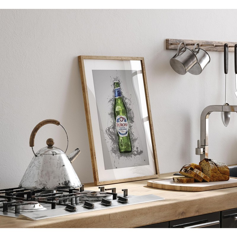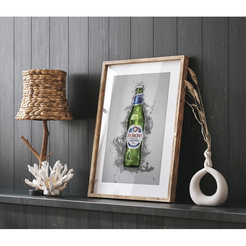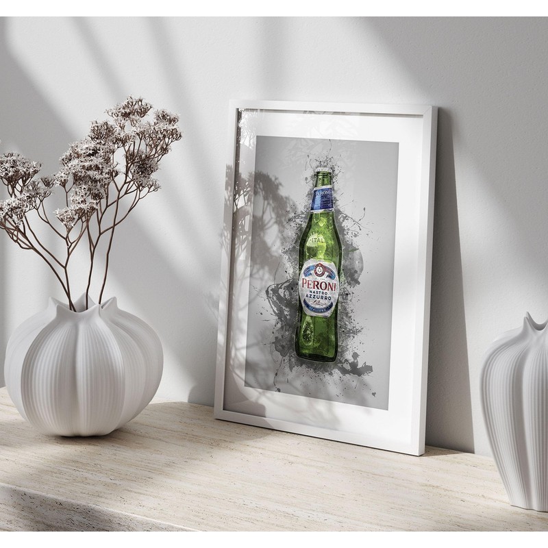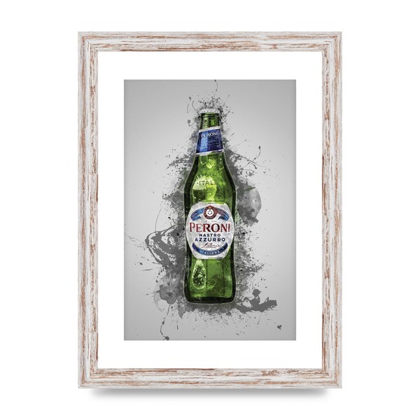 Lithobee - Peroni Bottle Splatter - Printed Wall Art Design in Sizes A2, A3 & A4 Framed in a Stylish Quality Coloured Frame or Unframed (A4 White Distressed Frame)