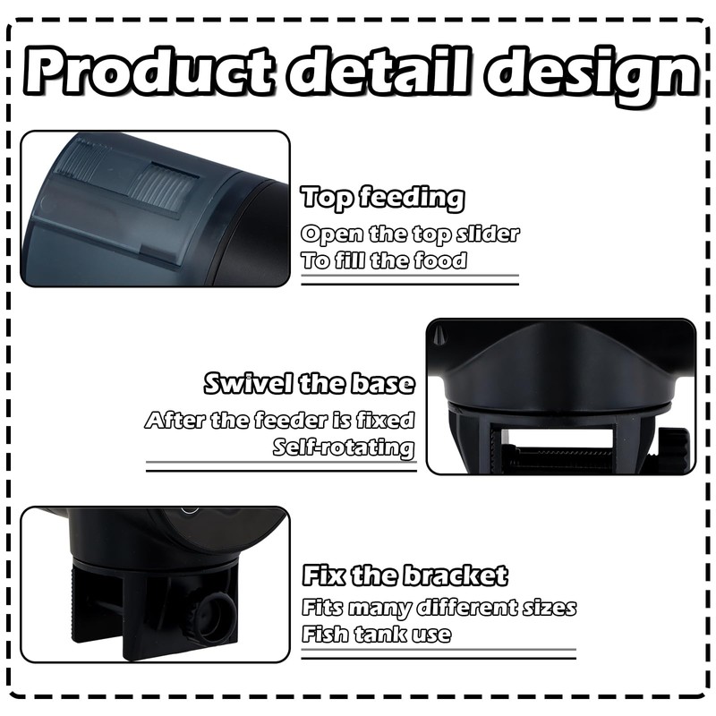 - 【Two Installation Methods】: Compatible with all tank types. Install it with an adjustable clamp for tanks up to 1 inch thick or use double-sided stickers. The 360° rotating design allows precise placement of the feeder.