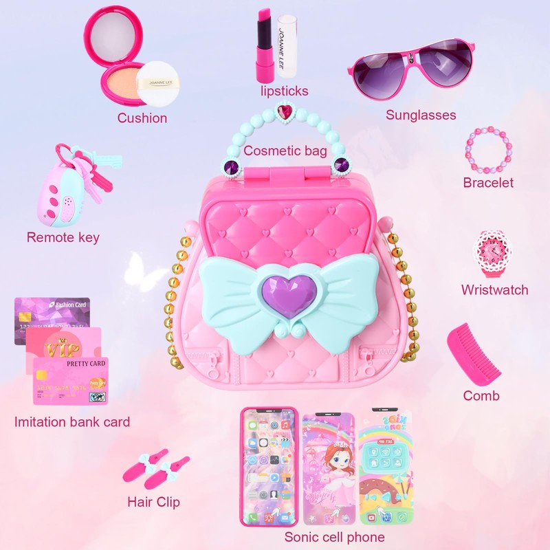 - Package includes: This all-inclusive set includes a lipstick, pressed powder, powder puff, a toy mobile phone (3 cases), a simulated car key, a simulated bank card x 3, sunglasses, a hairpin x 2, a comb, a bracelet and a toy watch. All items are neatly packed in a pretty pink butterfly cosmetic bag for easy carrying and storage.