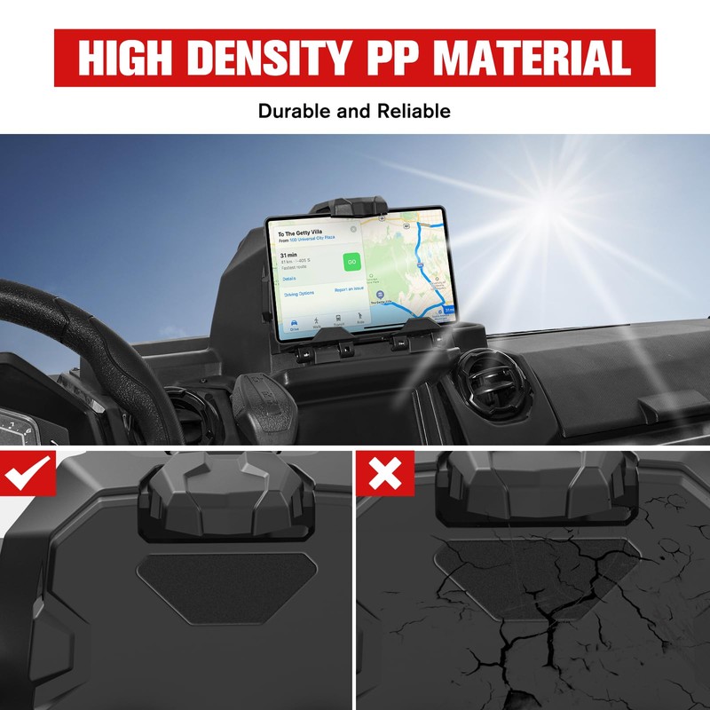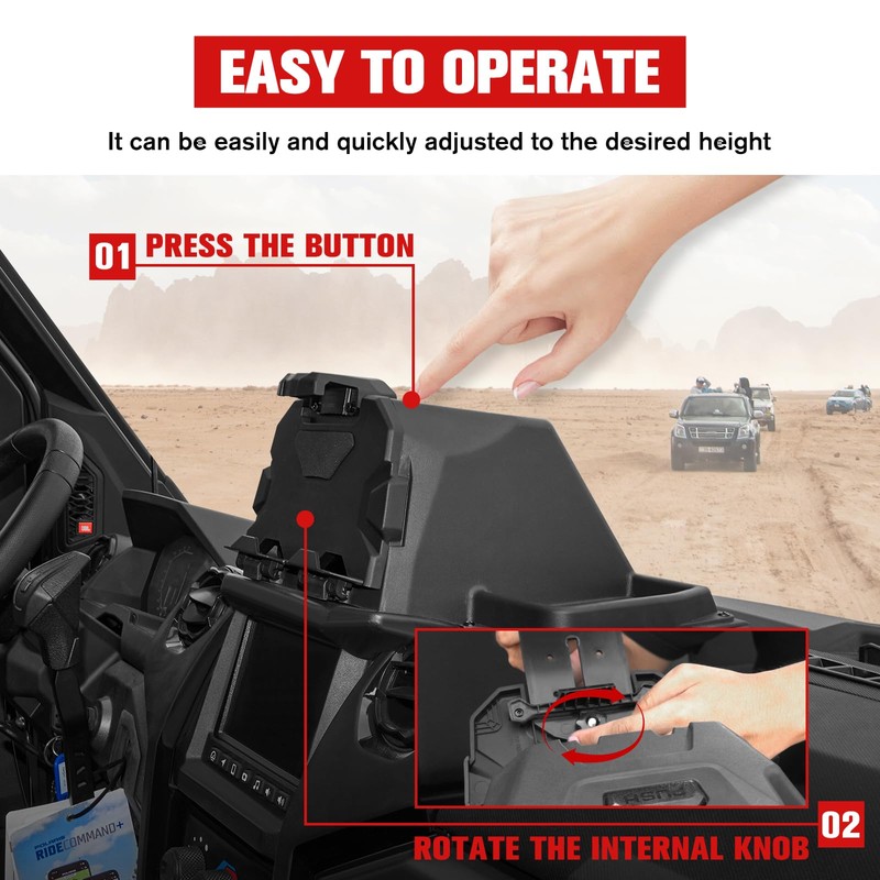- Cool Features: Adjustable stand height, supports most tablets and phones (5.1 "to 10"), will not hinder driving, allowing you to have a better off-road experience. Extra storage space, where small items such as keys and sunglasses can be placed in the storage box for easy storage