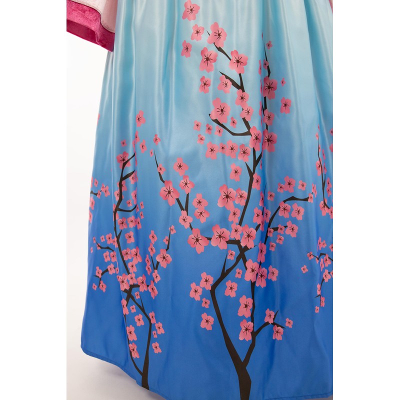 - Our Adult Enchanted Cherry Blossom dress has an elegance that cannot be denied, you almost won't believe your reflection! Stretch velvet bodice with fashionable v-neck and thick blue belt. Velvet flowing sleeves accented with cherry blossom pattern and hot pink velvet trim that match the beautiful ombre skirt with matching cherry blossom pattern. The back of the dress features a lace-up corset to ensure a perfect fit.