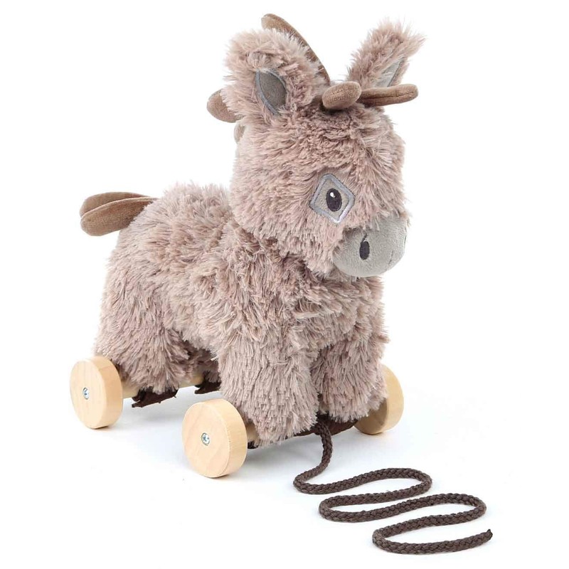 - 2-IN-1 TOY: Norbert Donkey is both a pull along activity toy and a huggable friend for little boys and girls. The wooden wheels can easily be removed, converting Norbert into a soft cuddly donkey hug toy for toddlers to hug and play with.