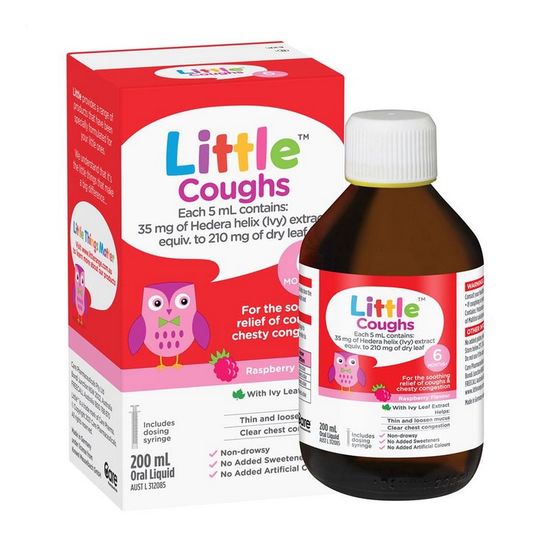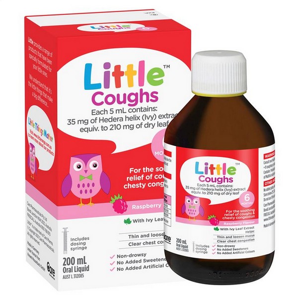 Little Coughs Oral Liquid Raspberry flavour with Ivy extract is for the soothing relief of coughs & chesty congestion. Includes dosing syringe.