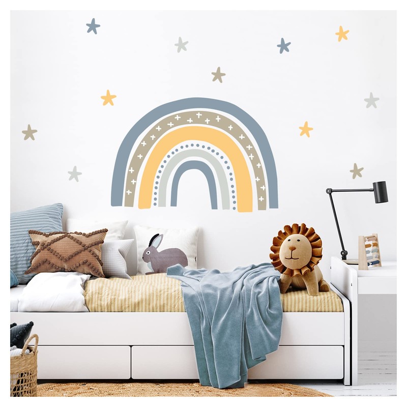 - Box contents: a wall sticker with rainbow and stars, the picture corresponds to 54 x 36 cm and the rainbow has a size of 25 x 17 cm (width x height) including instructions for easy application and a sample sticker.