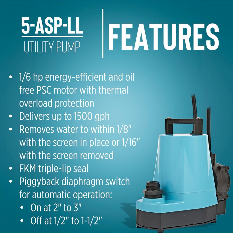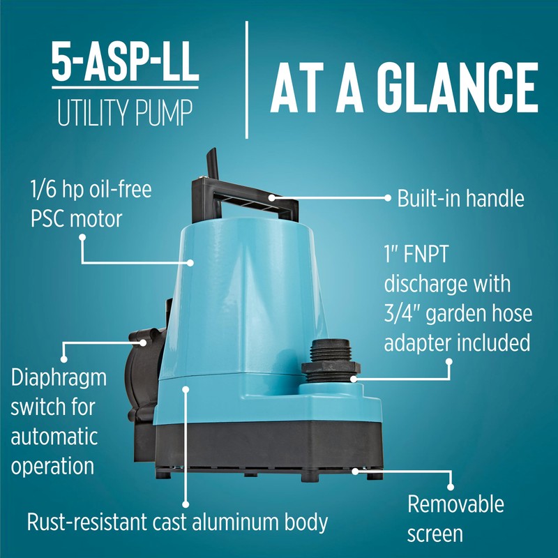 Little Giant 5-ASP-LL 115-Volt, 1/6 HP, 1500 GPH Automatic Aluminum Utility Pump with Low-Level Piggy-back Diaphragm Switch, 18-Ft. Cord, Blue, 505717