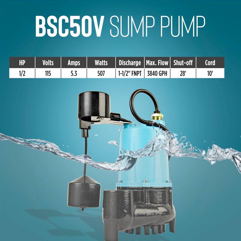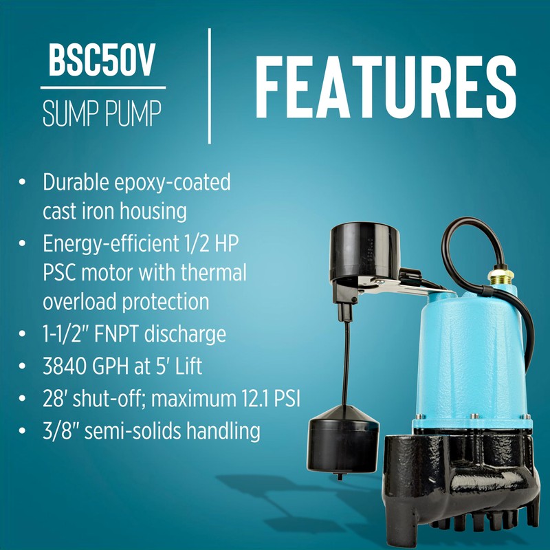Little Giant BSC50V 1/2 HP, 115 Volt, 3840 GPH Automatic Submersible Cast Iron Sump/Effluent Pump with Piggy-back Vertical Float Switch and 10-Ft. Cord, Blue, 511252