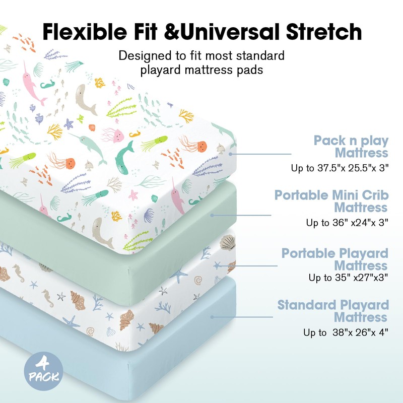 - IDEAL FOR BABY ESSENTIALS – Our 4 pack mini crib sheets(38"X 26")matches mini crib mattress and playard mattress perfectly, making as pack and play sheets,itcreates a comfortable playground and safe sleeping environment for your baby but also binds together the whole decor of your nursery as per its theme.