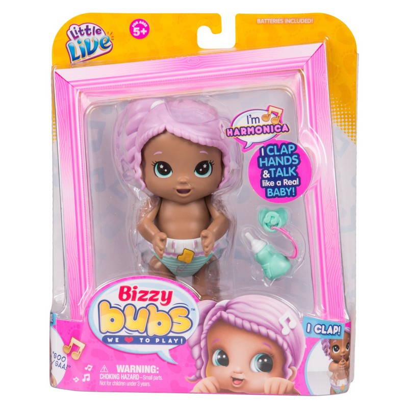 The cutest babies around are back and the family has grown! These little babies are way too busy for bedtime! They can’t wait to play and show you what they can do. Watch them dance, babble, giggle and clap the day away! Harmonica is a Bizzy Bub who loves to clap and dance. With her musical style on her hair and diaper she always sings a happy tune! Give her a bottle and hear her drink! Then put in her pacifier to give her a well earned rest! WARNING: Choking hazard -- Small parts. Not for children under 3 years WARNING: Contains button or coin cell battery. Hazardous if swallowed -- See instructions