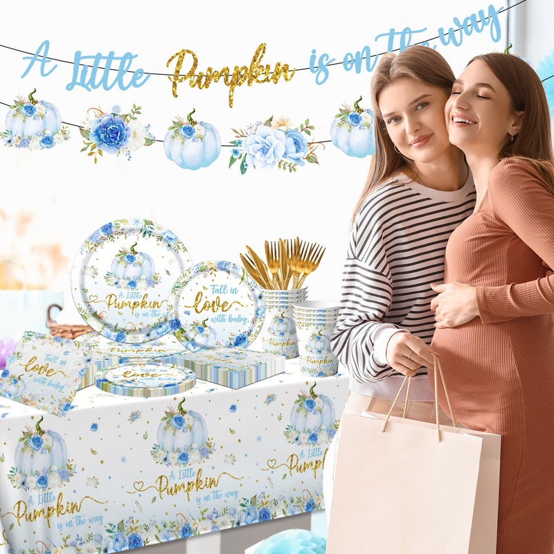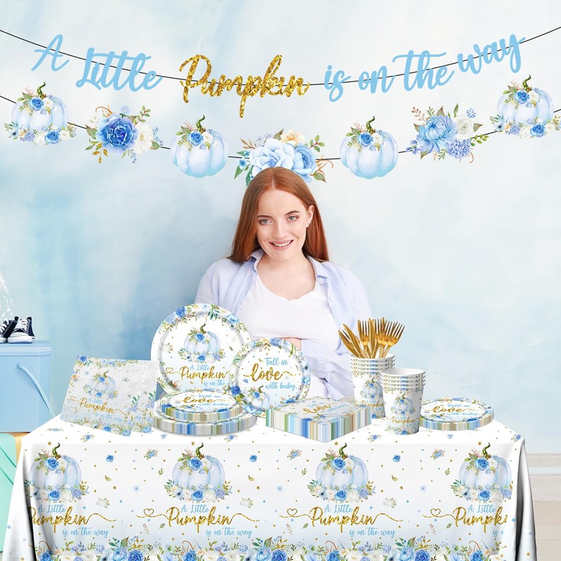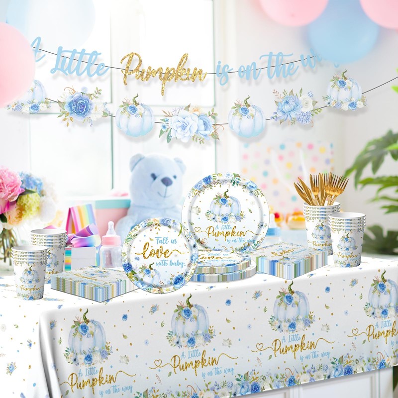 Little Pumpkin Baby Shower Party Decorations A little Pumpkin Is On The Way Tableware Little Pumpkin Banner Baby Shower Floral Pumpkin Banner,Tablecloth,Plates,Napkins,Cups,Forks and Knives (Blue)