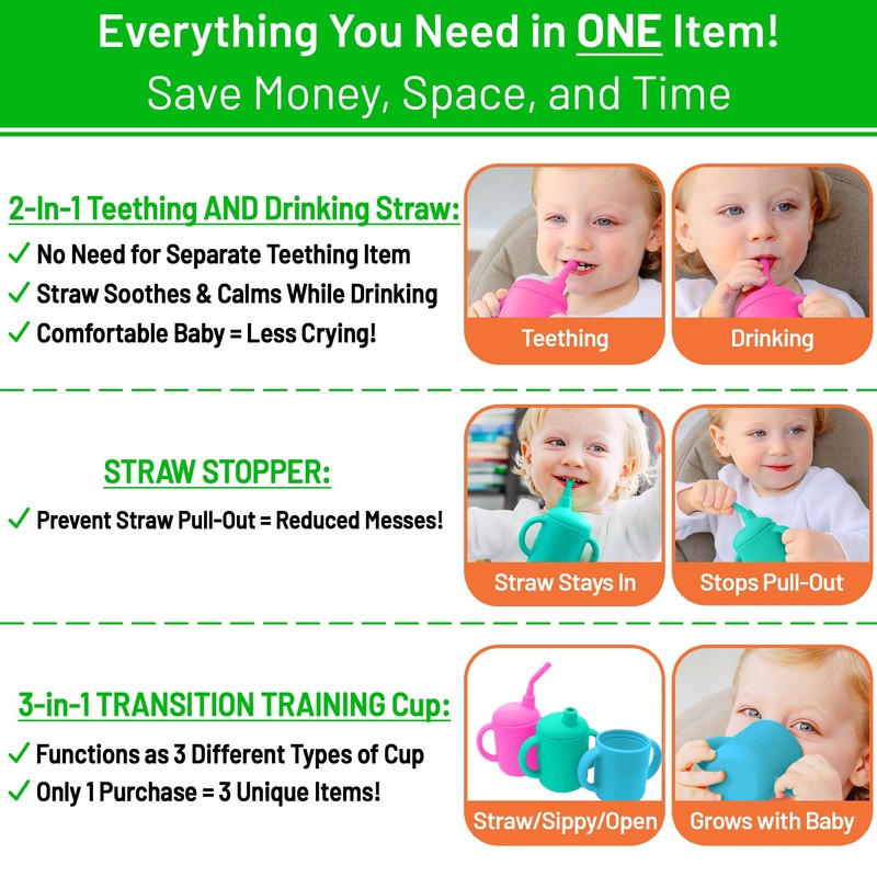 This versatile 3-in-1 silicone baby straw cup transitions seamlessly from a learning cup with straw for baby to a sippy cup and eventually, an open cup! Designed for little hands, these petite learning cups measure 2.4in wide and 4.1in tall. This sippy cup with handles is easy to grip and has a ventilation hole for smooth drinking. Made from food-grade silicone, each soft, squeezable silicone sippy cup is also dishwasher, oven, microwave and freezer safe - a blessing for busy moms. The 4oz capacity and a helpful line marker, means this trainer sippy cup keeps track of milk, juice or water! Cleaning is easy, with the included straw cleaning brush, and all parts are dishwasher safe.