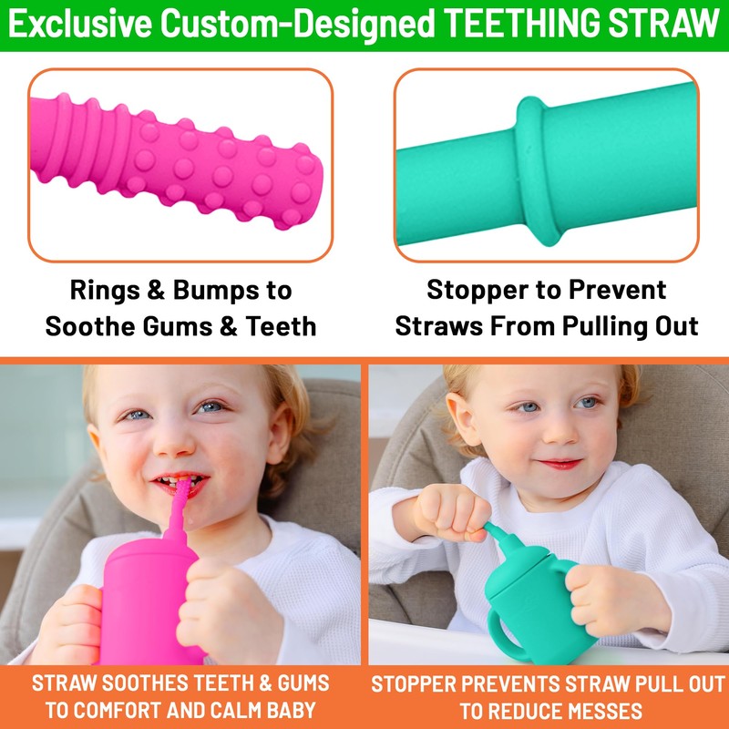 - ✅ TEETHING STRAW DESIGN: This innovative straw cup for 6 month old features teething bumps for tactile sensation and teething relief. Straws on sippy cups for 6 month old babies are usually wide, but our straw sippy cup is customized for flow control, to strengthen tongue muscles and swallowing.
