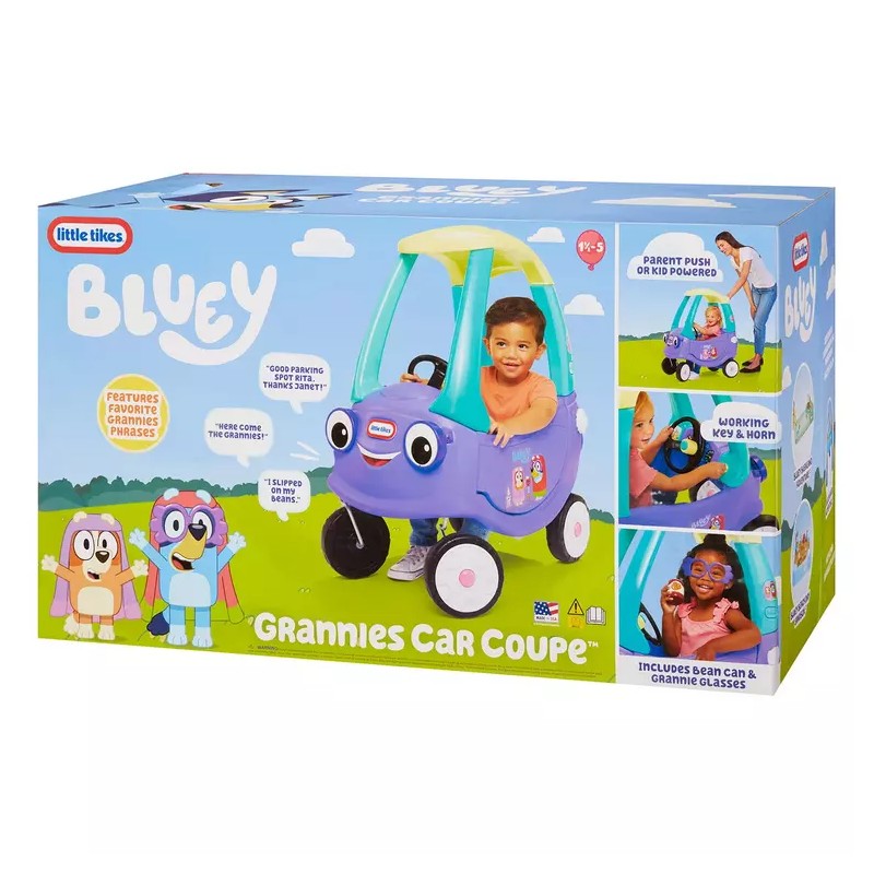 Adding to the play value, this Bluey-themed Cozy Coupe comeswith a pair of Grannie glasses and a can of Baked Beans – a Bluey favorite!These accessories enhance the imaginative play, allowing your child to fullyimmerse themselves in the Bluey universe. Whether they're pretending to beBluey, Bingo, or the Grannies, these accessories will help bring their playtimestories to life.