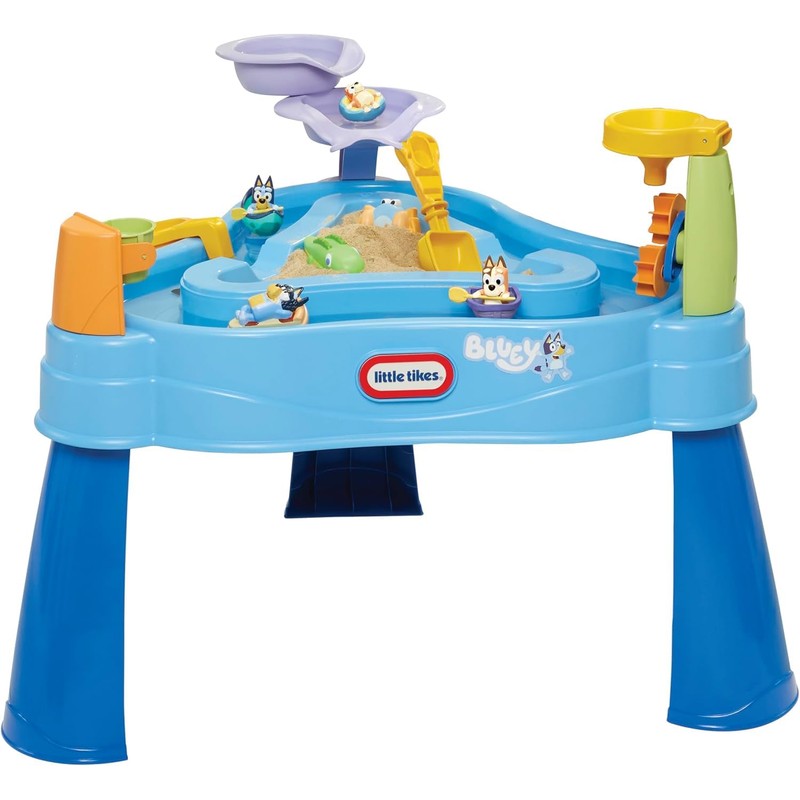 - SPLASH WITH BLUEY – This water table’s fun design encourages social and imaginative playtime where multiple kids can have fun together for hours. Its Bluey-themed accessories encourage imaginative play and a fun sensory experience with water and sand (not included).