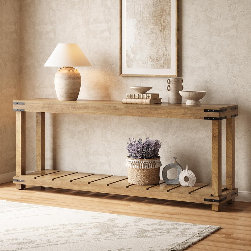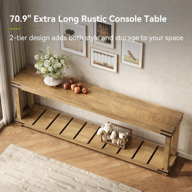 - Space-Saving: The wooden entry table, with its 70.9-inch tabletop and two-tier open shelving, provides ample space to showcase your belongings. Its skinny, narrow design ensures it doesn't take up much room