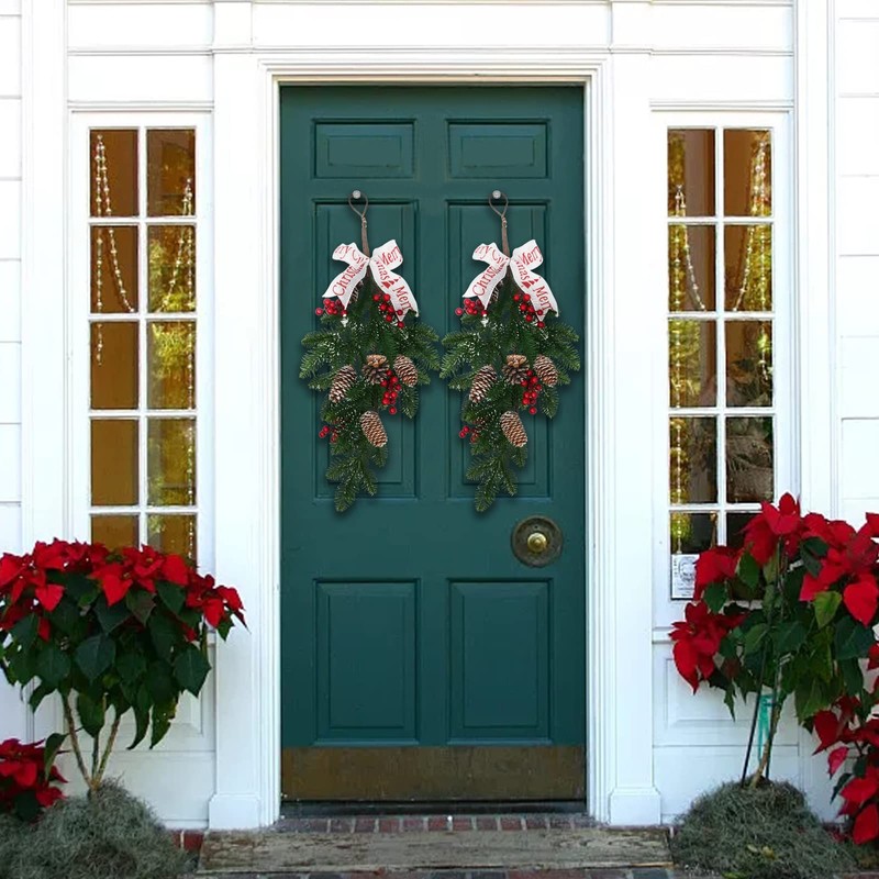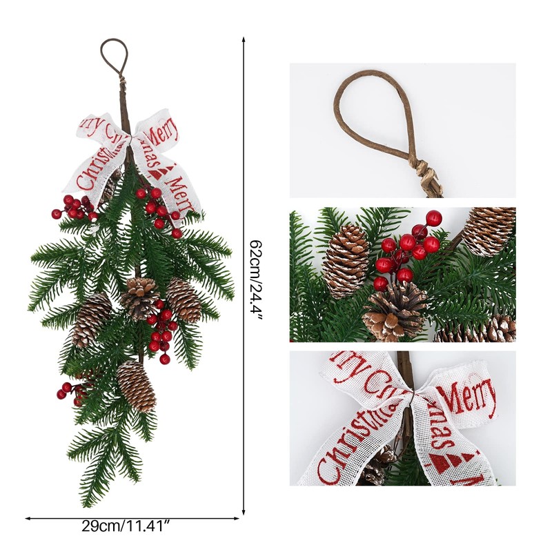 - Happy Christmas: This traditional Christmas teardrop swag features ribbons, pinecones & berries on branches of noble fir. A delightful way to add instant Christmas spirit to any window frame,entryway, mantle, or other area of the home.